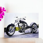 Transform your space with this striking LED wall art featuring a meticulously detailed custom chopper motorcycle. The black and chrome design captures the essence of classic American custom motorcycles, with its elongated front forks, chunky tyres, and gleaming chrome engine components. The standout feature is the battery-operated LED headlight that illuminates realistically, adding depth and dimension to the artwork. Powered by standard AA batteries with a convenient on/off switch, this piece brings the motorcycle to life in any room. The dramatic side profile showcases the bike’s aggressive stance, flowing lines, and premium craftsmanship. Perfect for motorcycle enthusiasts, garage spaces, man caves, or any contemporary interior seeking a bold automotive accent piece. The combination of photographic detail and interactive lighting creates a unique visual experience that’s sure to become a conversation starter.