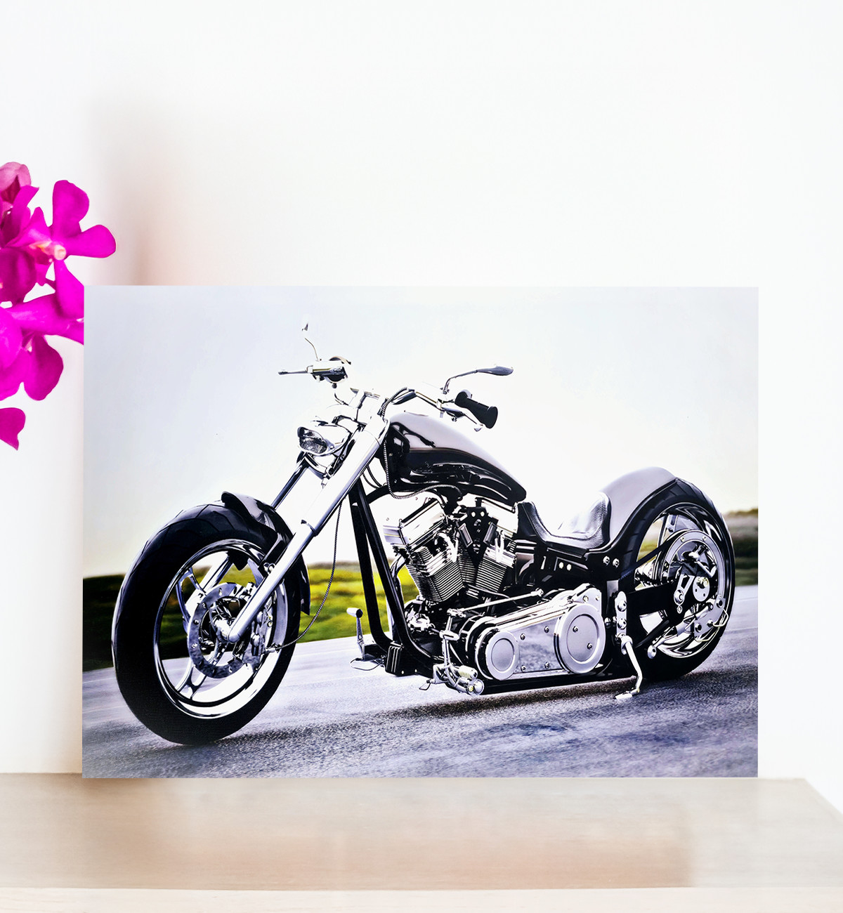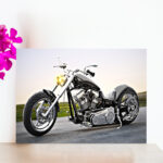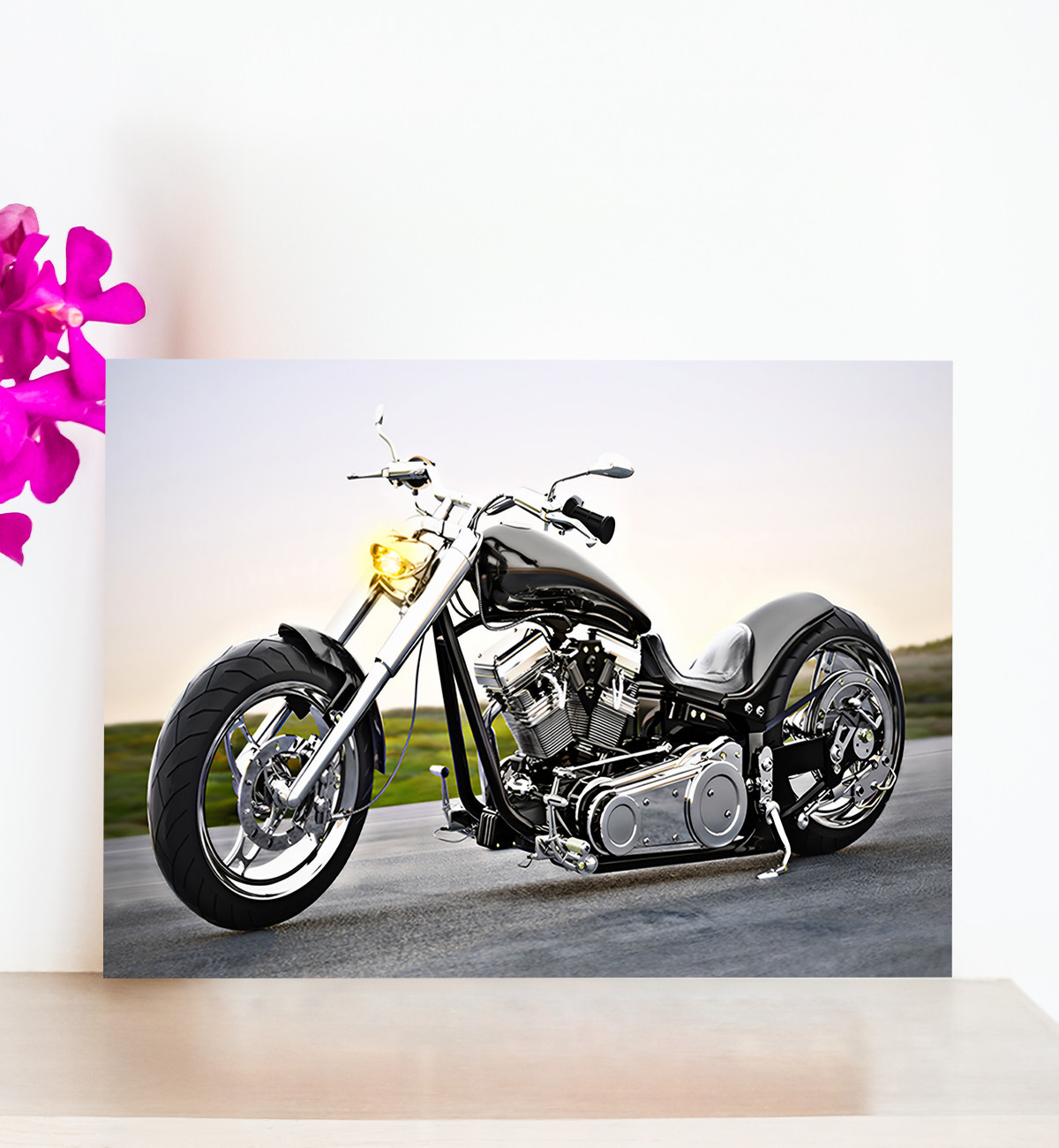 • PREMIUM ARTWORK: Showcases a detailed black and chrome custom motorcycle design against a dramatic outdoor backdrop