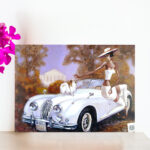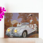 Transform your living space with this stunning piece of vintage automotive art. This elegant canvas painting captures a dreamy autumn scene featuring a pristine white classic car, accompanied by an adorable Japanese Chin dog. The artwork masterfully depicts the timeless beauty of a luxury convertible against a backdrop of warm autumn foliage and a stately building. The composition showcases exquisite details, from the car’s distinctive chrome grille and gleaming headlamps to the fluffy white Japanese Chin perched confidently on the bonnet. The artistic style combines classical elegance with a touch of glamour, enhanced by the seasonal setting with trees adorned in rich golden and brown hues. This sophisticated wall art print makes a perfect focal point for any room, whether it’s your living area, study, or office space. The nostalgic charm and refined aesthetics of this artwork will add a touch of classic sophistication to your interior décor, making it an excellent conversation piece that celebrates both automotive history and artistic excellence.